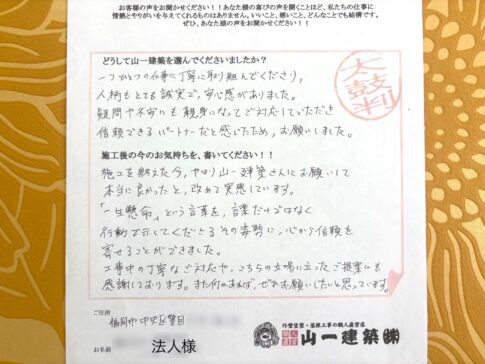 それでは、論より証拠。山一建築に届く実際の口コミ評判をご覧ください。