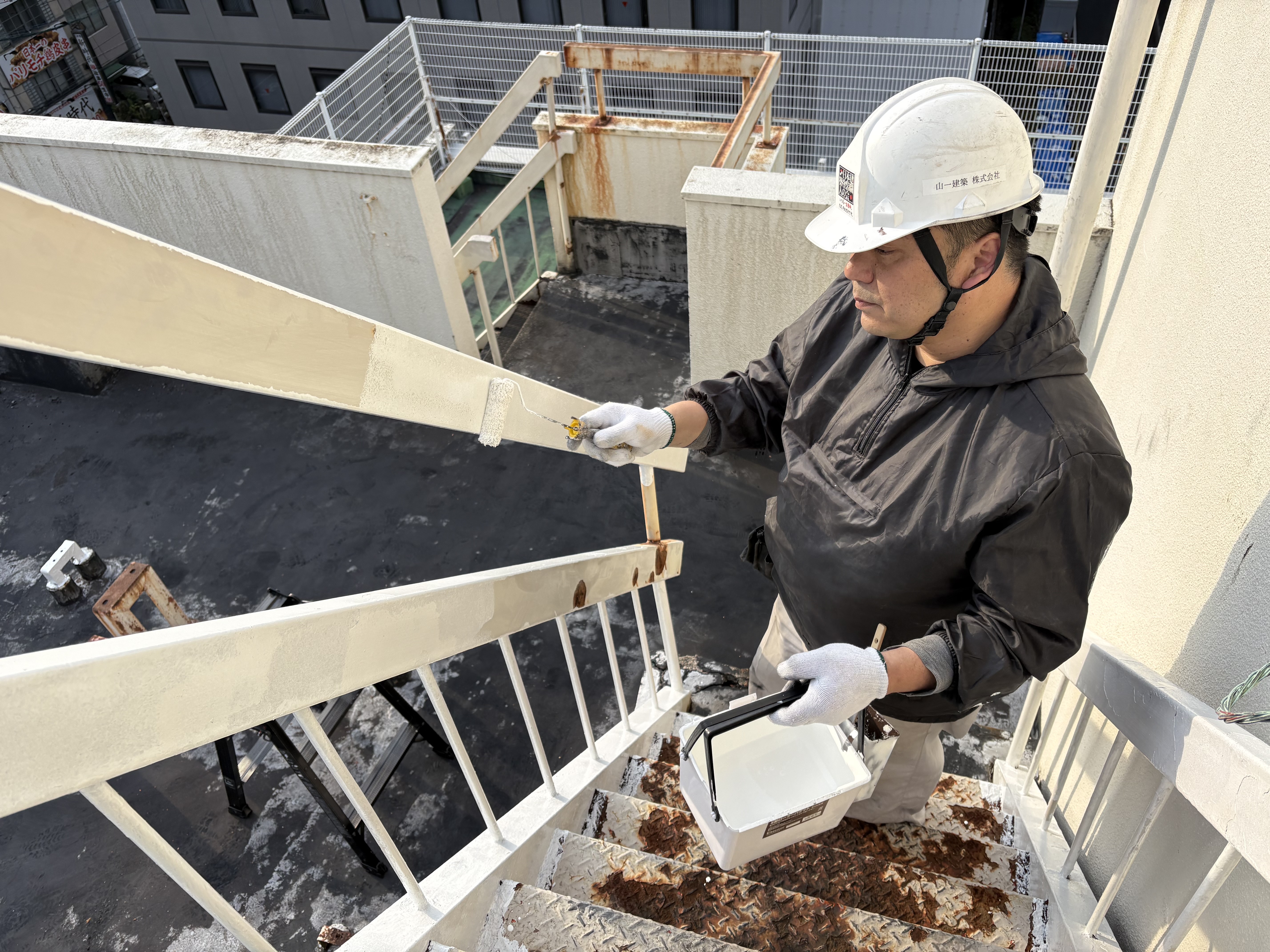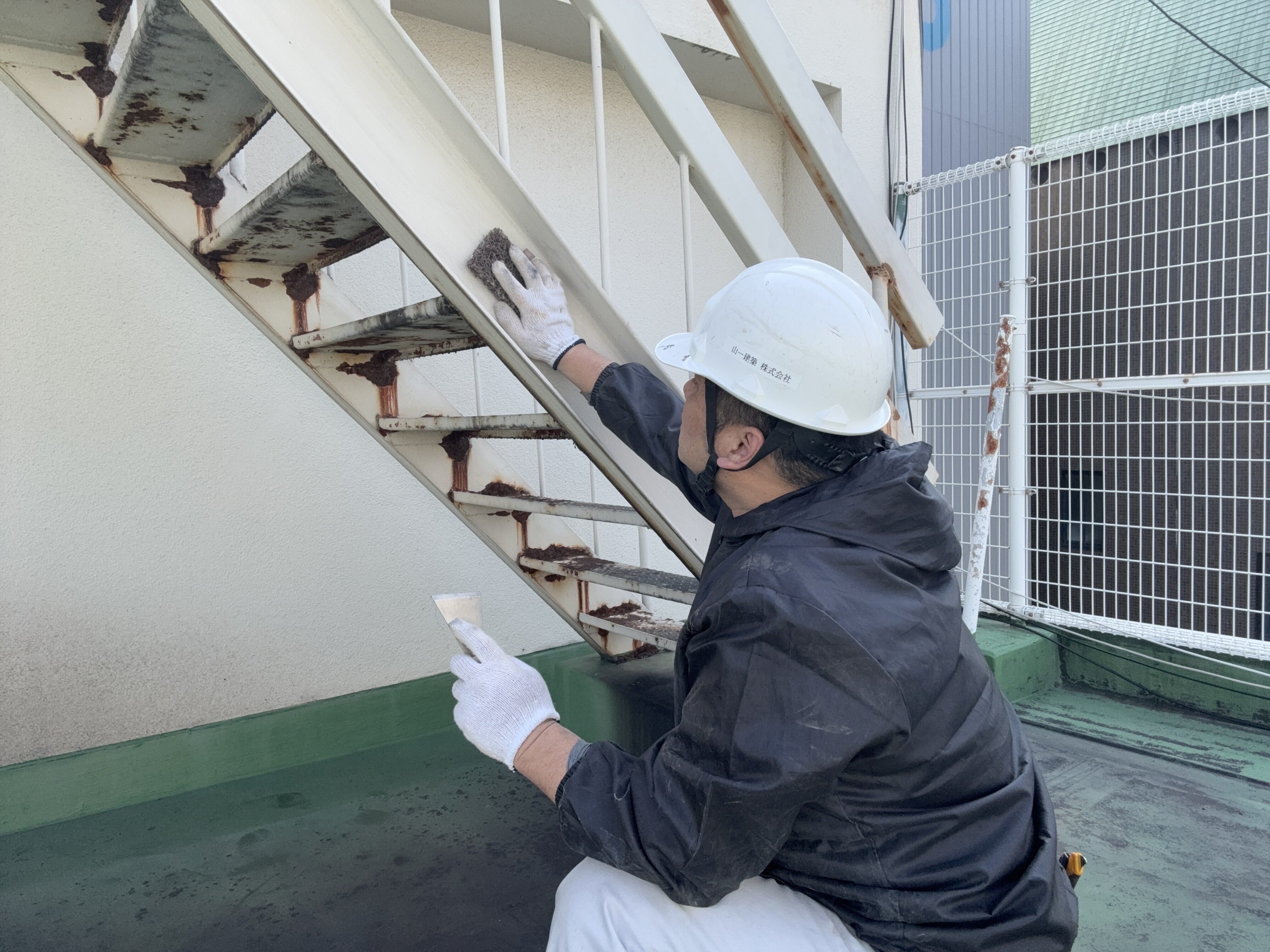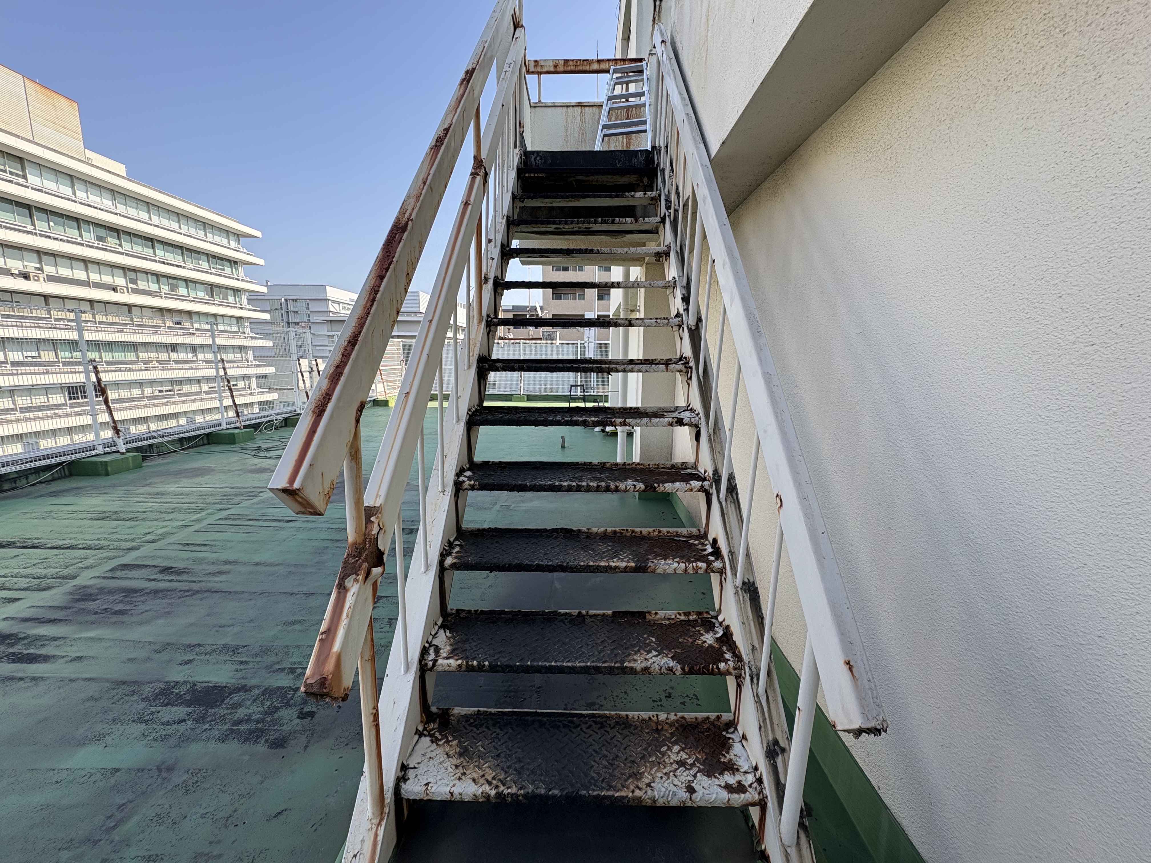今日は博多区博多駅東で外部鉄骨階段を塗装してきました。外部の鉄骨階段は