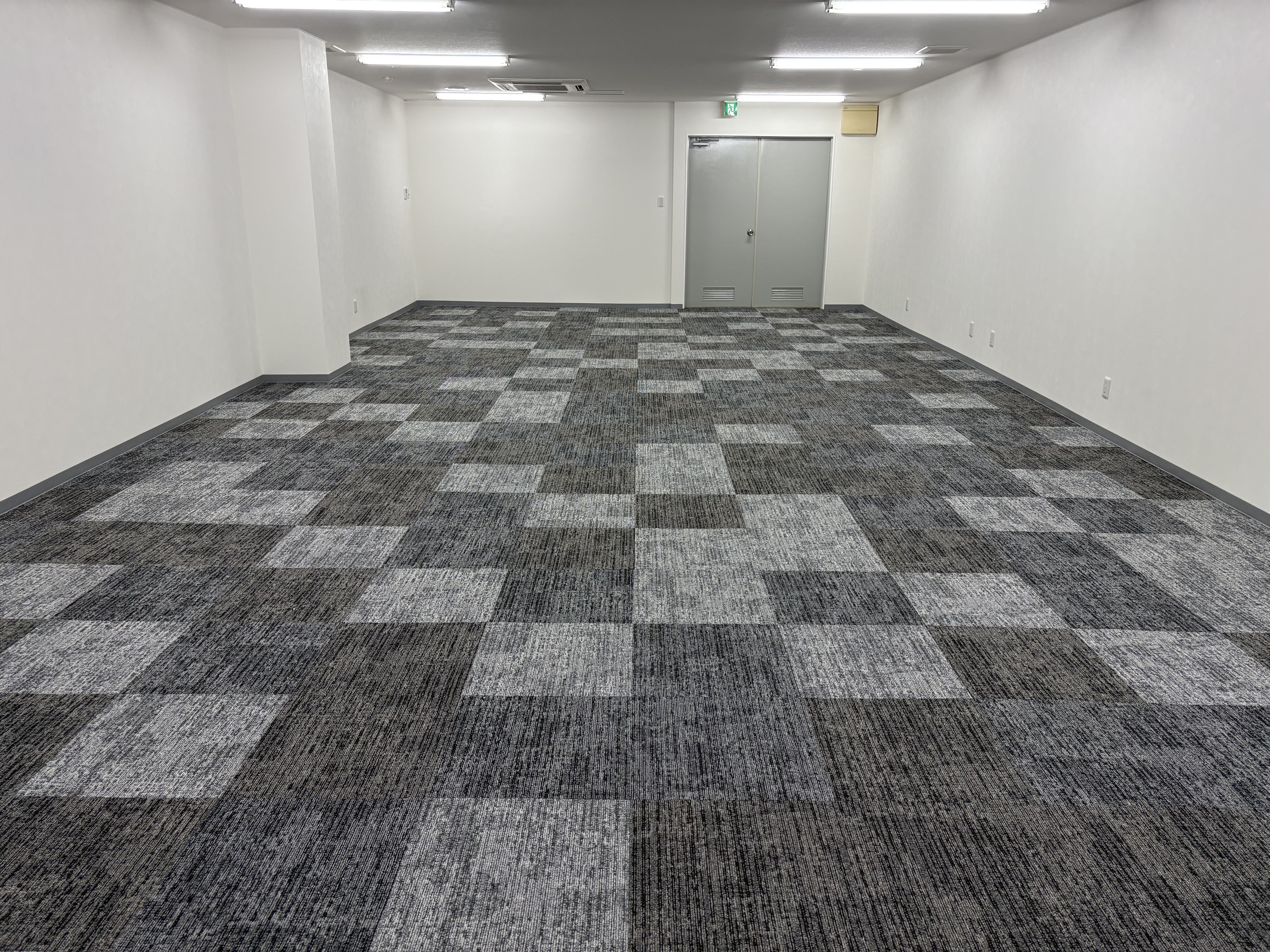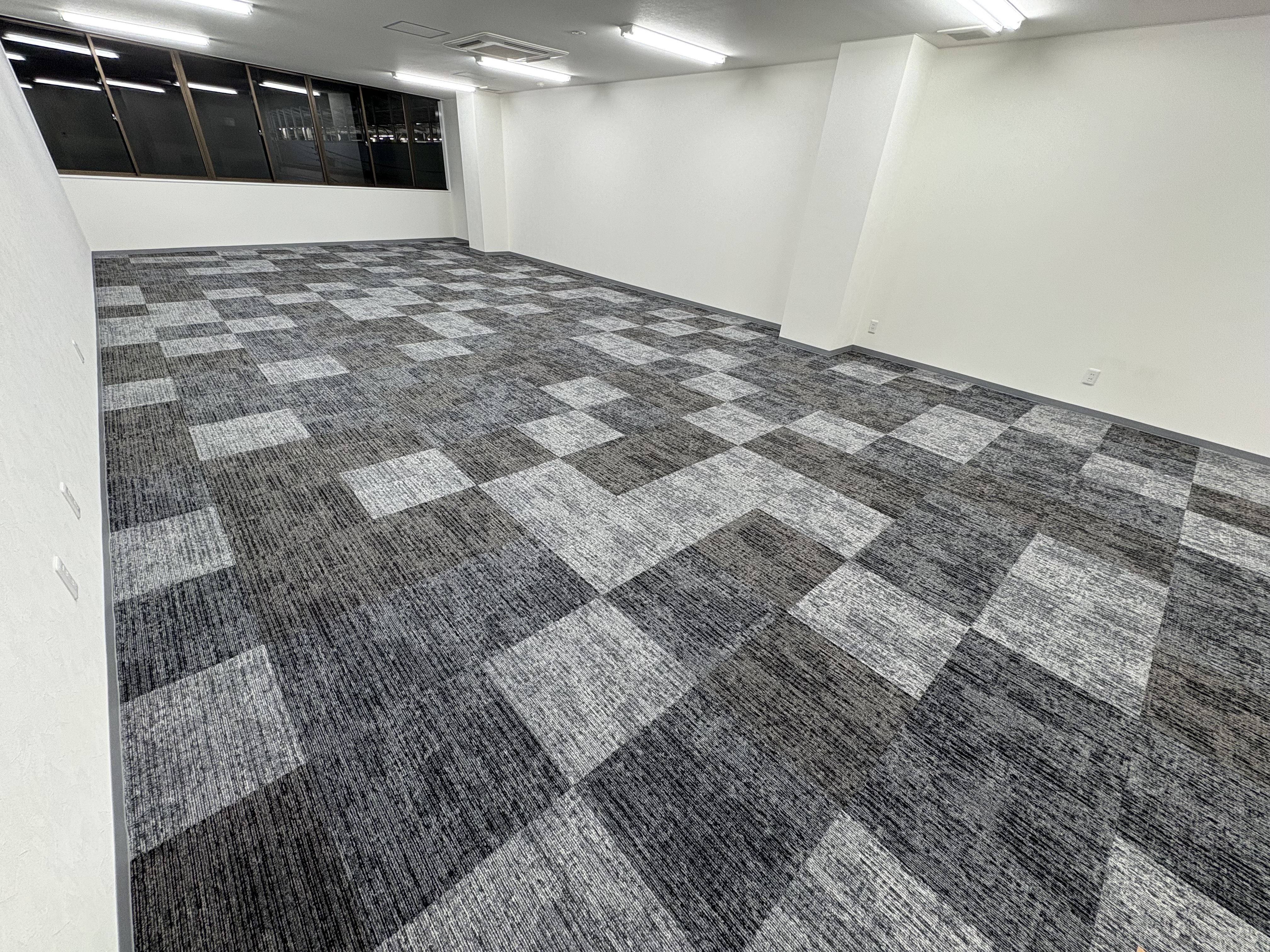 3色のデザインカーペットを使い仕上げた賃貸事務所をご覧ください。